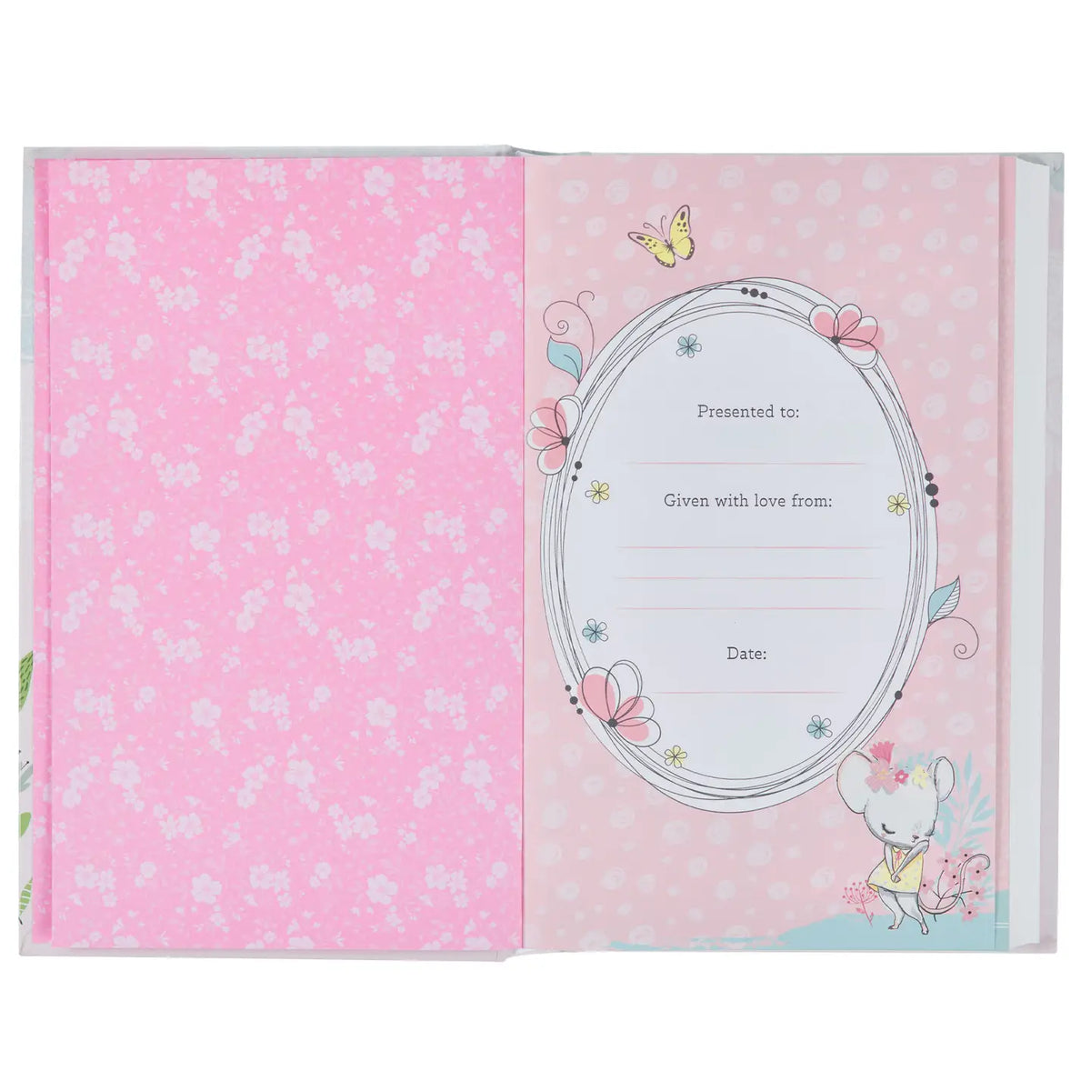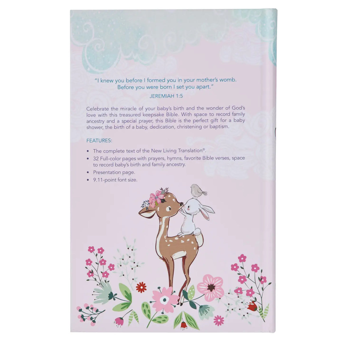 Embrace the gift of new life God has granted by adding the Blush Pink Hardcover NLT Keepsake Bible for Girls to a baby shower gift. Crafted to preserve precious memories for years to come, this keepsake is a heartfelt reminder of the special moments surrounding your baby's birth. Screen-printed forest animal design, Black embossed screen-printed title and version reference, Hardcover, New Living Translation, Satin ribbon marker, Text printed in black, 9.11-point font, 1064 pages, Presentation page, 32 full-color pages with hymns, prayers, and Bible memory verses, Pages for family tree, birth, baptism, or christening details, Prayer or mom and dad, Double column format, Lay-flat Smyth-sewn binding, Packaged in a full-color printed gift box, Size: 8.8" x 5.6" x 1.2" (224 x 142 x 30mm)