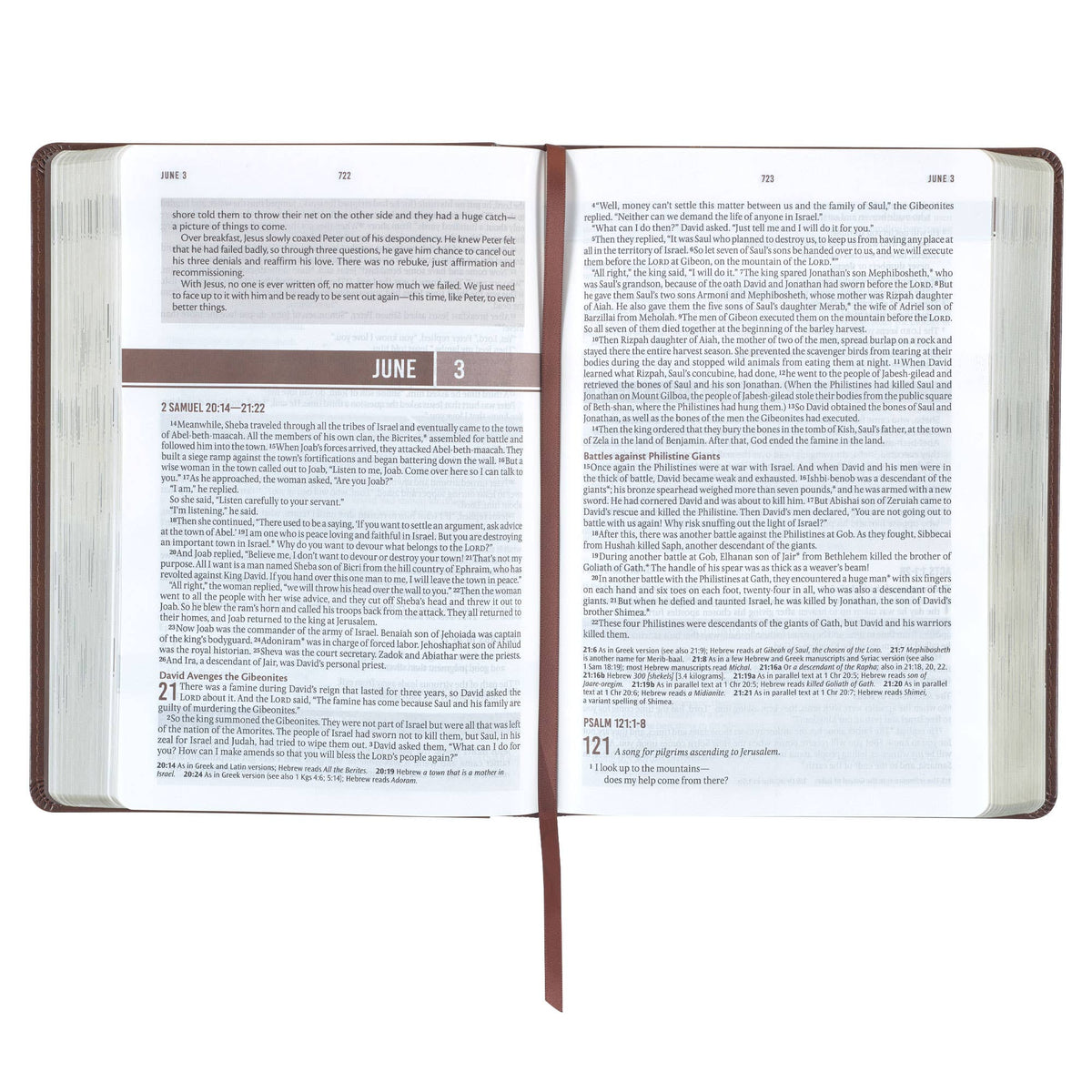 Heat-debossed frame with intricate floral fill and corner scroll cover design, Chestnut brown faux leather, Gold-foiled title, Heat-debossed translation reference, Flexcover, New Living Translation, Satin ribbon marker, 1824 gilt-edged pages, Two-color interior, Single column format Presentation page, Daily portions from Psalms, Proverbs, Old and New Testament, 730 inspiring devotional insights by Mike Beaumont, 10-point text, Packaged in a full-color printed cardstock sleeve, Size: 9.6" x 6.8" x 1.8" (244 x 173 x 46mm)