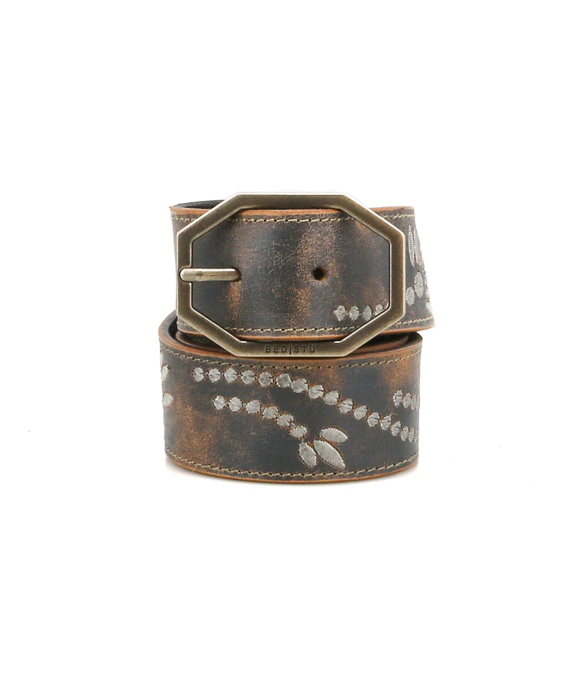 Mohawk is a women's distressed leather belt featuring intricately embroidered details with tonal stitching. The floral design will surely get noticed, along with the uniquely shaped metal buckle. Enjoy the Mohawk belt through belt loops or around your waist with your favorite maxi dress.