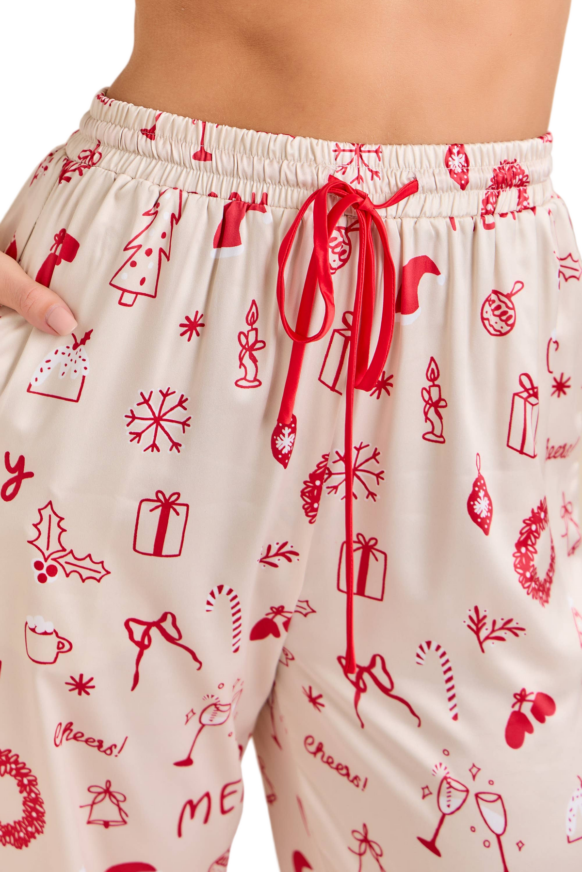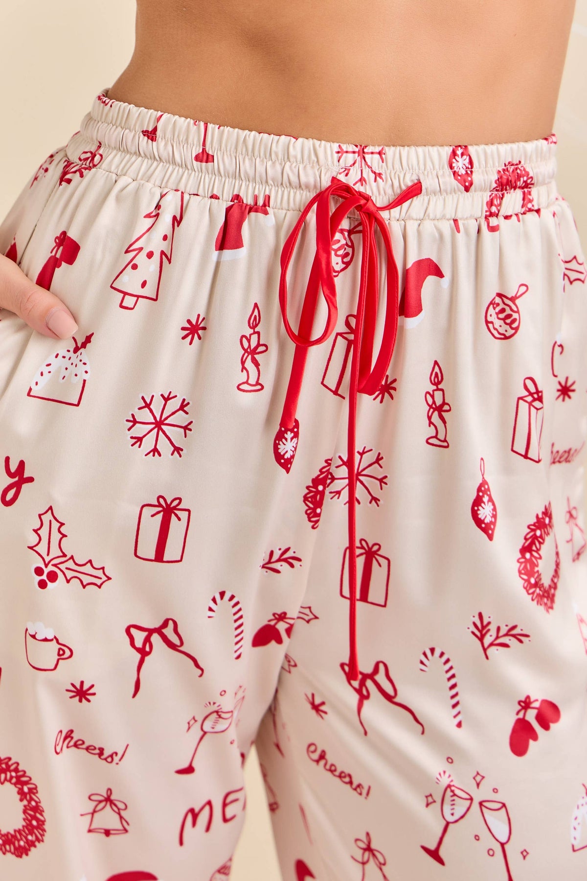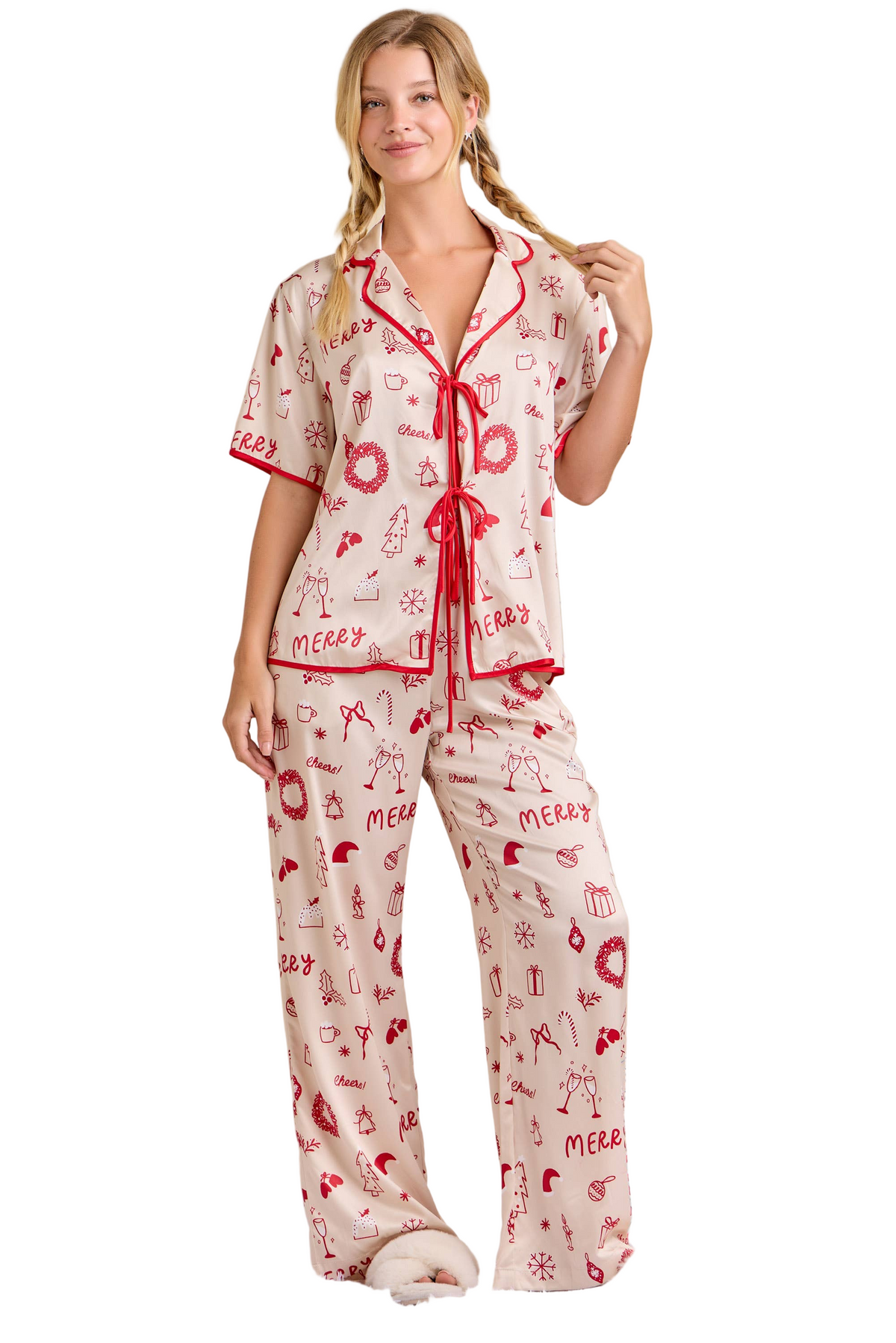 Get cozy this season in our Cream Holiday Print Pajama Set. Featuring festive red holiday motifs on a cream base, with button-up short sleeve top and relaxed fit pants, this set blends comfort with cheerful holiday charm. Perfect for lounging, gifting, or matching family pajamas. ✨ Features: Cream pajama set with red holiday print Button-up short sleeve top with tie detail Long relaxed fit pants for comfort Red piping trim adds festive contrast šŸŽ„Ā