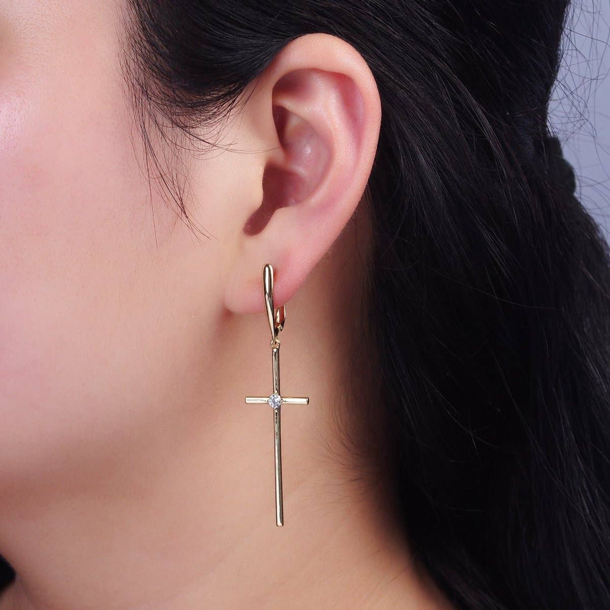 14K Gold Filled Clear CZ Latin Cross Drop English Lock Hoop Earrings | AE402