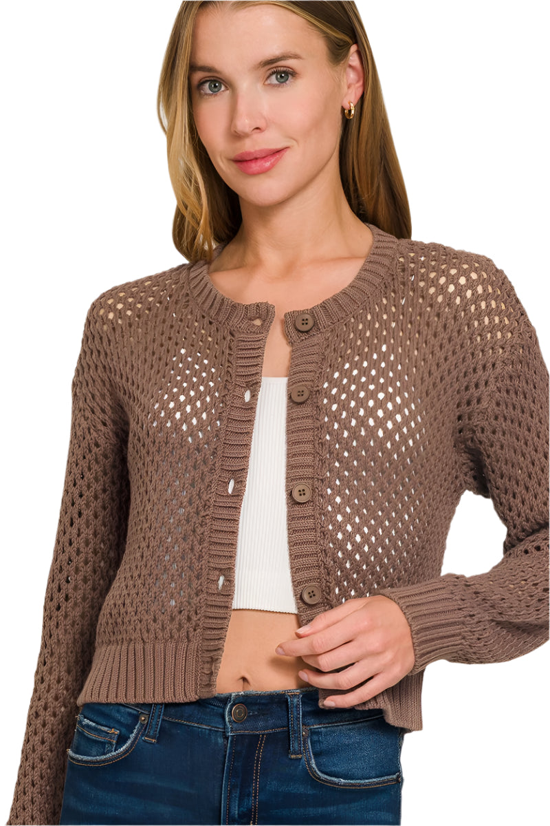 Women's Crochet Knit Button-Up Cardigan, Open Mesh Pattern, Long Sleeve Cropped Style