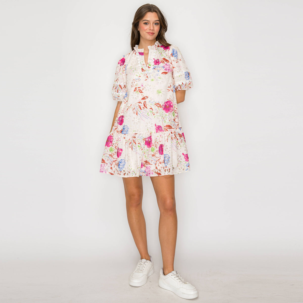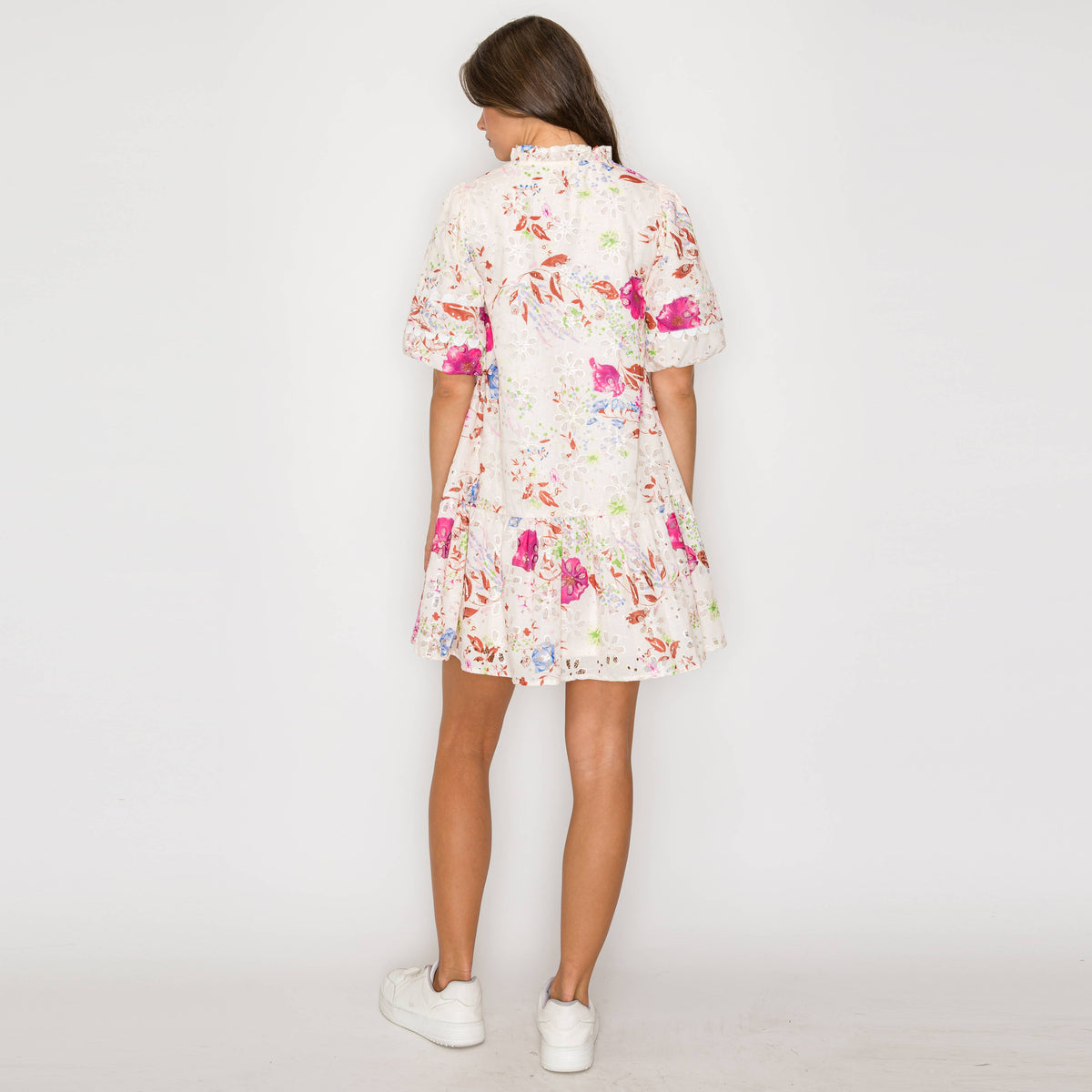 Pink Flower Print Eyelet Mini Dress